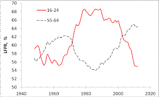 Figure 1. The rate of participation in labor force in the youngest age group 16 to 24 years and in the group between 55 and 64 years of age, i.e. before retirement.