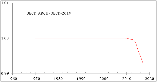 Figure 6 depicts the ratio of the MPD GDP per capita and three other time series, all 4 series are first normalized to their respective levels in 1970 and the ratios are calculated. As a result, all ratios start from 1 and one can see the discrepancy of the real GDP per capita estimates. For example, the MPD/BEA curve drops to 0.98 in 2015, and the other two ratios fall even deeper to 0.975. In standard statistical analysis, the results may differ, especially after 2010. Figure 7 illustrates the change in the real GDPpc estimates published by the same agency - OECD. One cannot exclude the possibility that the current estimates of any economic parameters are subject to revisions in the future, and these revisions may change statistical estimates for all economic relationships.